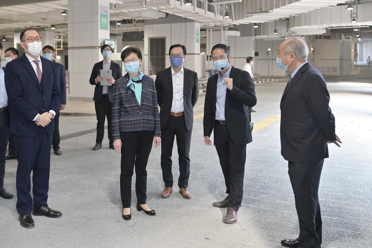行政长官林郑月娥视察全新落成的裕民坊公共运输交汇处,该项目下周五启用,基座一楼和地面分别设有巴士和小巴总站,备有多个出入口连接商场和周边街道,将是全港最大有盖公共运输交汇处。