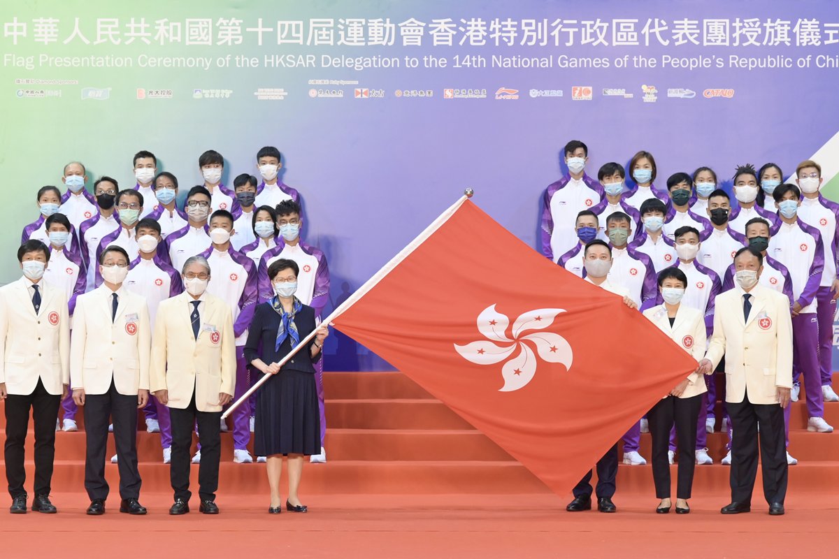 行政长官林郑月娥今日主持中华人民共和国第14届运动会香港特别行政区代表团授旗仪式,向民政事务局局长兼特区代表团团长徐英伟授予区旗。