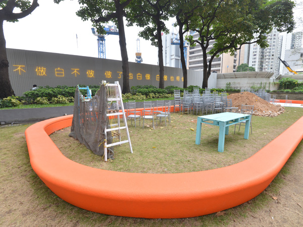 宋冬在草地上的《白做园》利用社区弃用的物资,为油街实现建造一个盆景,并用霓虹灯显示「不做白不做,做了也白做,白做也得做」的句子,展示艺术家的理念。