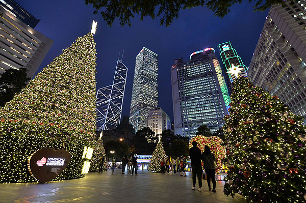 在中环方面,旅发局再次在皇后像广场设置了约四层楼高的圣诞树,场内更有其他具冬日特色的布置。今年的一大特色,是情侣们可将爱情锁扣在场内特设的围栏上,一同许下甜蜜祝愿,使这个冬日更添浪漫温馨。至于中环新海滨的活动更多姿多彩,除了新设的摩天轮外,还有刚开幕的欧陆嘉年华,当中有老少咸宜的活动,相信可为市民和旅客带来欢乐难忘的体验。